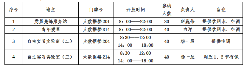 近日,内蒙古呼和浩特市迎来持续高温天气,为全力做好学生高温避暑工作,学院党委始终本着服务学生、围绕学生、关照学生的理念,决定即日起开放四间“计科空调屋”作为自习教室,努力为青年学生们营造清凉舒适的学习环境。现将开放时间和地点予以公布,小伙伴们赶快来纳凉学习吧!