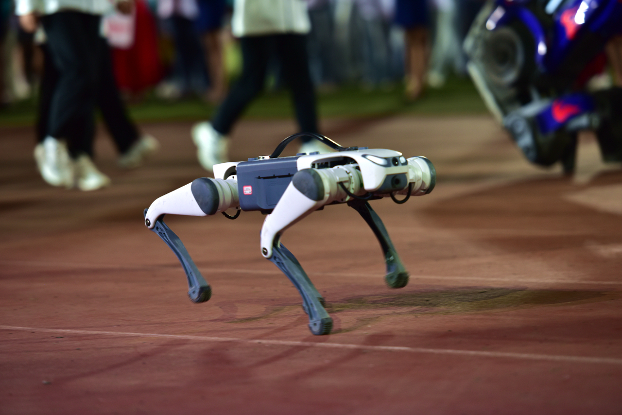本次开幕式上,人形机器人模型擎天柱、大黄蜂以其高大威猛的形象成为了人群中的焦点,极大地激发了学生们对科技创新的兴趣,展现了计算机科学的无穷魅力。形态逼真的轮腿式平衡机器人由PP电子游戏网站机器人与人工智能创新中心的师生自主研发,集成了多种先进的人工智能技术,具有精准的动作和灵敏的反应,能够灵活地完成各种复杂的动作,充分展示了我校在人工智能和机器人技术方面的成功探索。