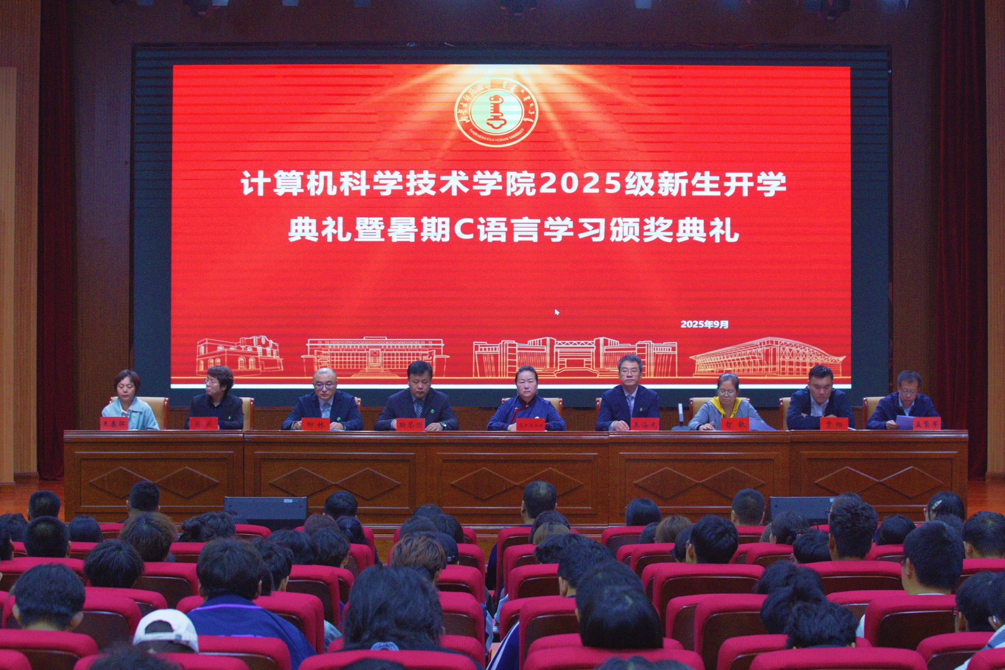 9月27日,PP电子游戏网站举行2025级本科生开学典礼暨暑期C语言学习颁奖典礼在盛乐校区图书馆报告厅举行,共迎358名2025级本科新生。学院党委书记乌日其木格,院长王海龙,副院长斯琴图、智敏、柳林、贾阳出席开学典礼,各系部负责人、辅导员、新生班主任参加开学典礼,典礼由副院长柳林主持。