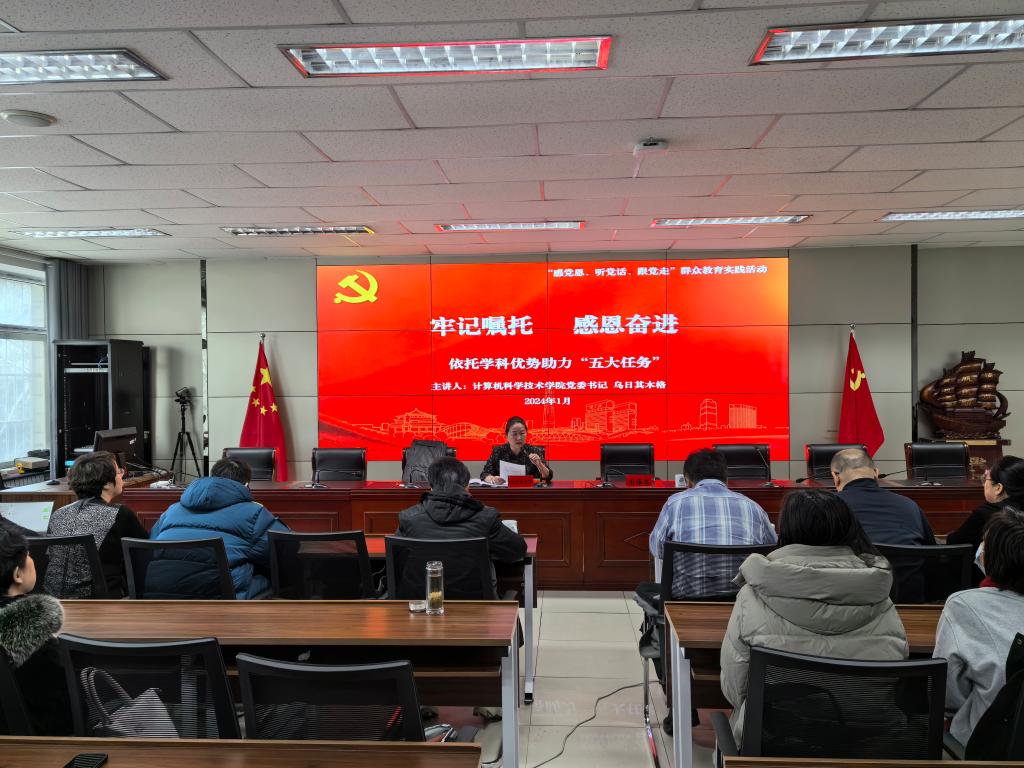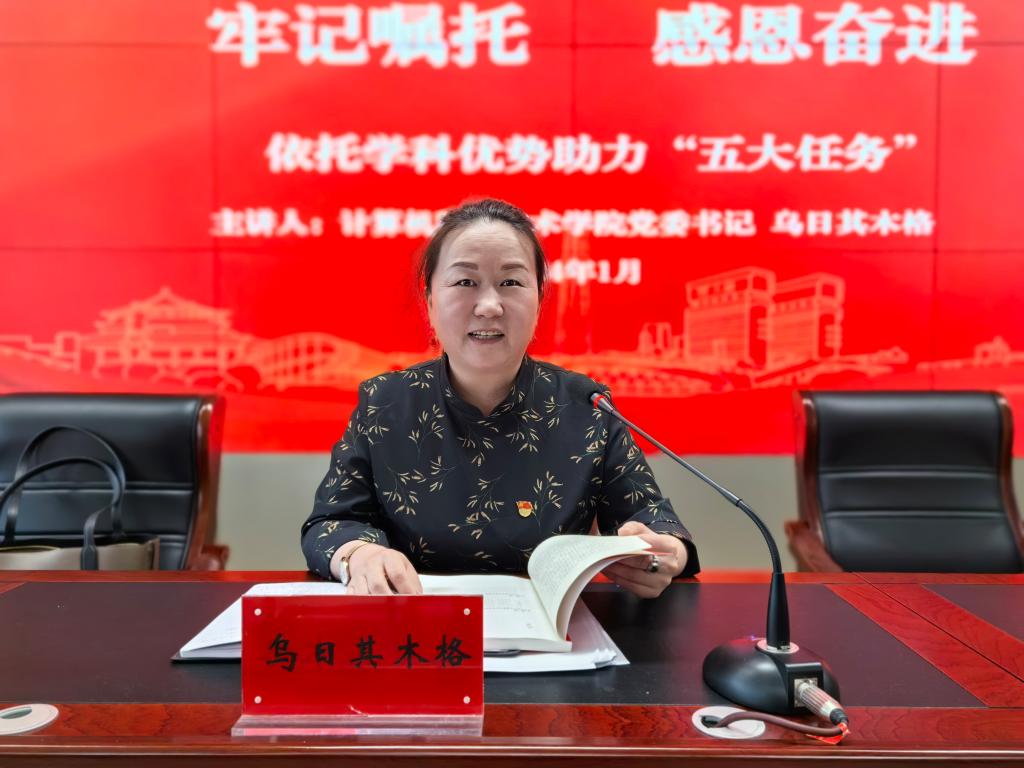 为深入学习贯彻党的二十大精神,深刻领悟习近平新时代中国特色社会主义思想的真理力量和实践伟力,特别是学懂弄通做实这一重要思想的“内蒙古篇”和“民族篇”,全面落实习近平总书记交给内蒙古的五大任务和全方位建设“模范自治区”两件大事,进一步深化主题教育成果,按照《PP电子游戏网站“感党恩、听党话、跟党走”群众教育实践活动实施方案》要求,1月9日PP电子游戏网站党委书记乌日其木格为学院全体教职工讲授主题为《牢记嘱托,感恩奋进,依托学科优势助力“五大任务”》的专题党课。