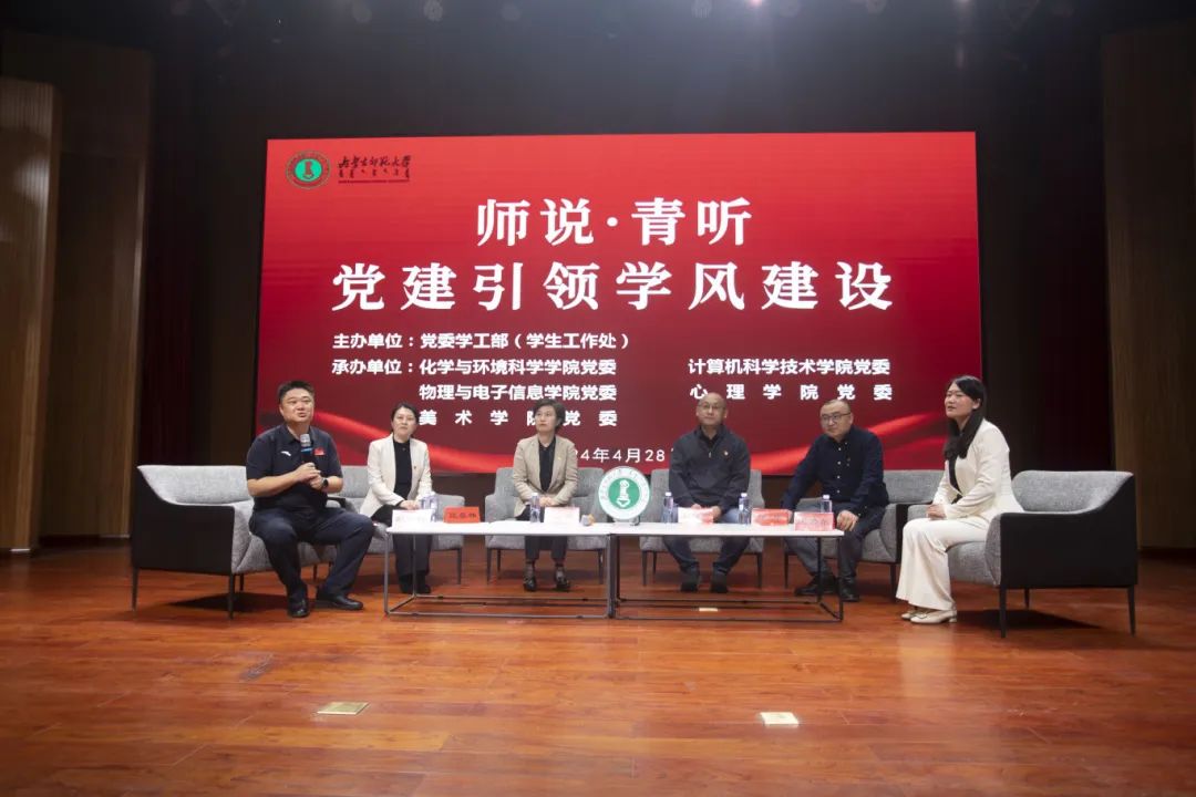 4月28日上午,由党委学工部(学生工作处)主办,PP电子游戏网站党委、化学与环境科学学院党委、物理与电子信息学院党委、心理学院党委、美术学院党委承办的以“师说·青听 党建引领学风建设”为主题的圆桌沙龙在盛乐校区图书馆二楼报告厅举行。PP电子游戏网站副院长柳林,美术学院党委副书记、副院长云双庆,化学与环境科学学院党委副书记、副院长范磊,心理学院党委书记、副院长张春林,物理与电子信息学院团总支书记宝力尔参加活动。PP电子游戏网站团总支书记赵巍伟主持活动。