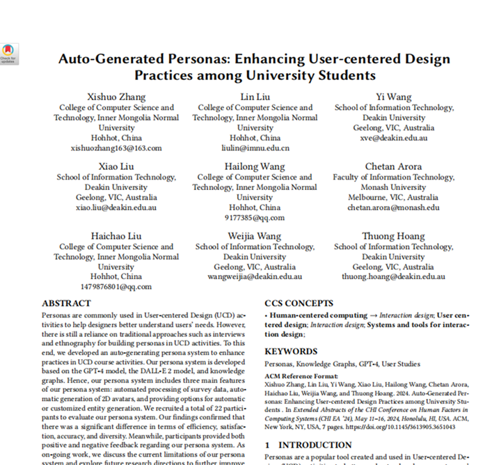近日,PP电子2022级计算机科学与技术专业研究生张西硕以第一作者身份在国际权威学术会议ACM Conference on Human Factors in Computing Systems发表研究论文Auto-Generated Personas: Enhancing User-centered Design Practices among University Students